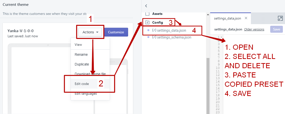 - Open file settings_data.json. Select ALL and delete. Paste copied preset from external file.