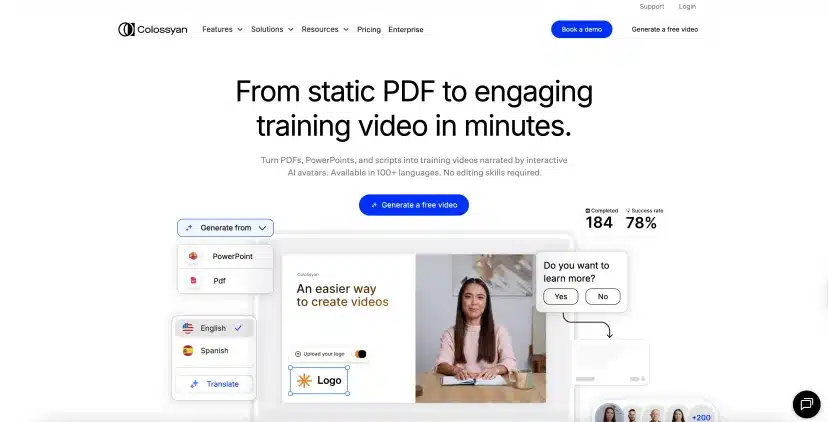 Colossyan stands out for its interactive video features, allowing you to add quizzes, branching paths, and feedback that keep viewers engaged. The avatars are realistic enough for most projects, although lip-sync isn’t as polished as top competitors. With support for 80+ languages, custom avatar options, and fast video generation, it’s a solid option for teams who want more than passive video content.