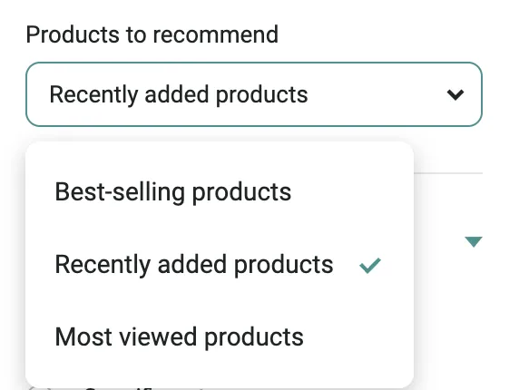 Also, in the same product feed setting interface, there’s an option to choose between dynamic feed options like best-selling products, most viewed products, new products, or even AI-enhanced options like products a customer may also like.