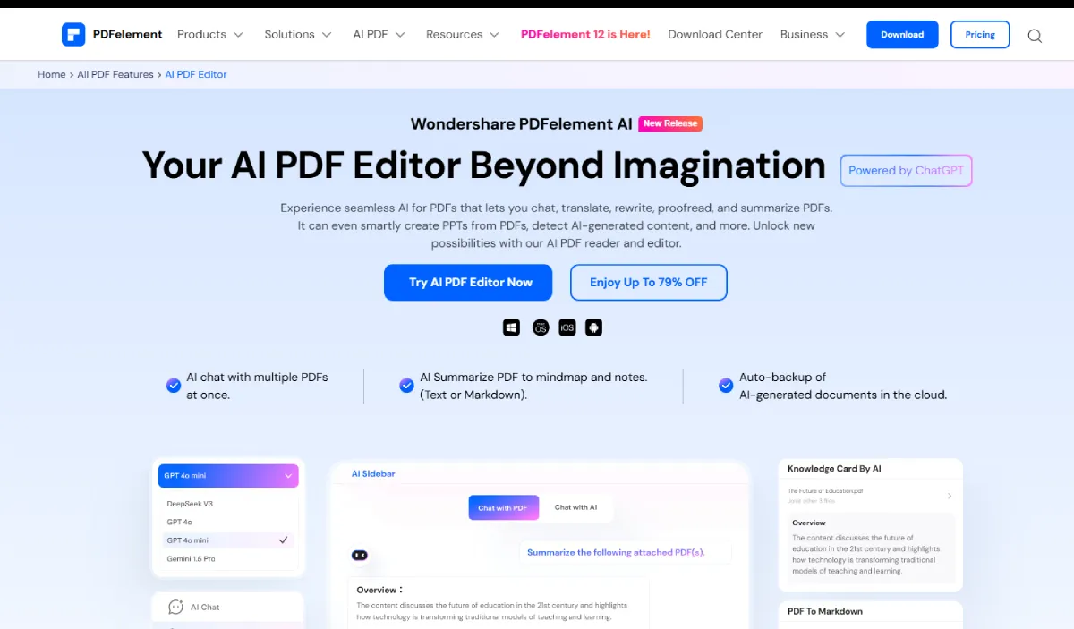 PDFelement AI | Trial only | 1GB | Advanced | 50+ | 9/10 | Excellent |