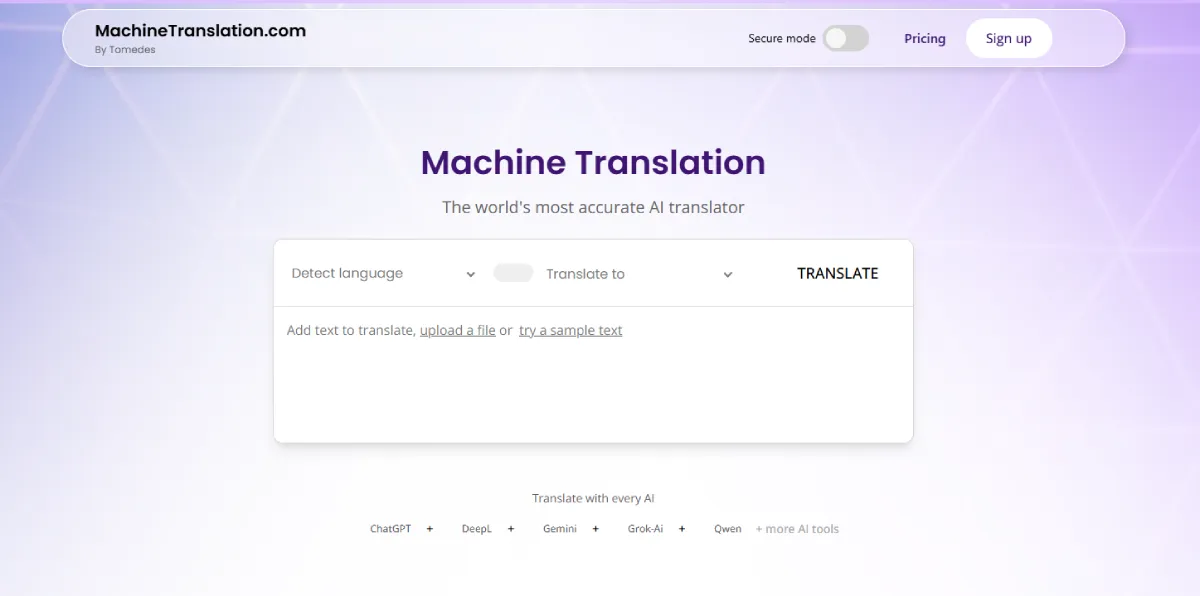 MachineTranslation.com, developed by Tomedes, is one of the most accurate AI translators. It’s the only platform that lets users compare results from top LLMs like Google, DeepL, ChatGPT, Claude, and others, in a single view. Users can refine tone, terminology, and style using the AI Translation Agent, which now includes memory for registered users, saving preferences across projects.