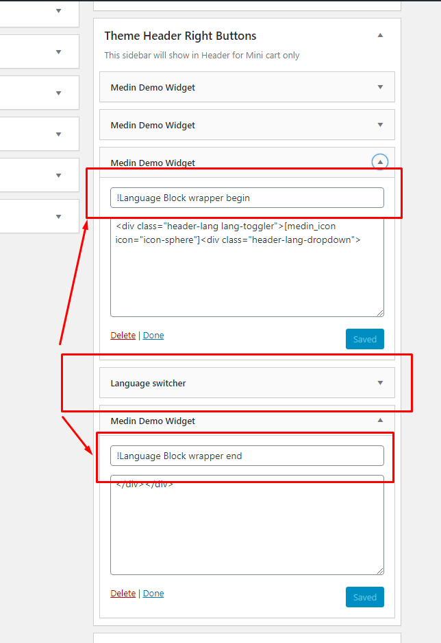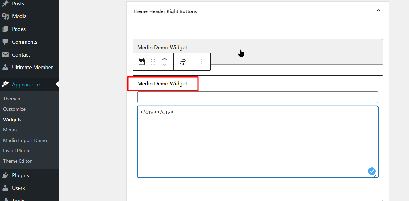 Add 2 widgets named as Medin Demo Widget in the Theme Header Right Buttons. Names for widgets are not required.