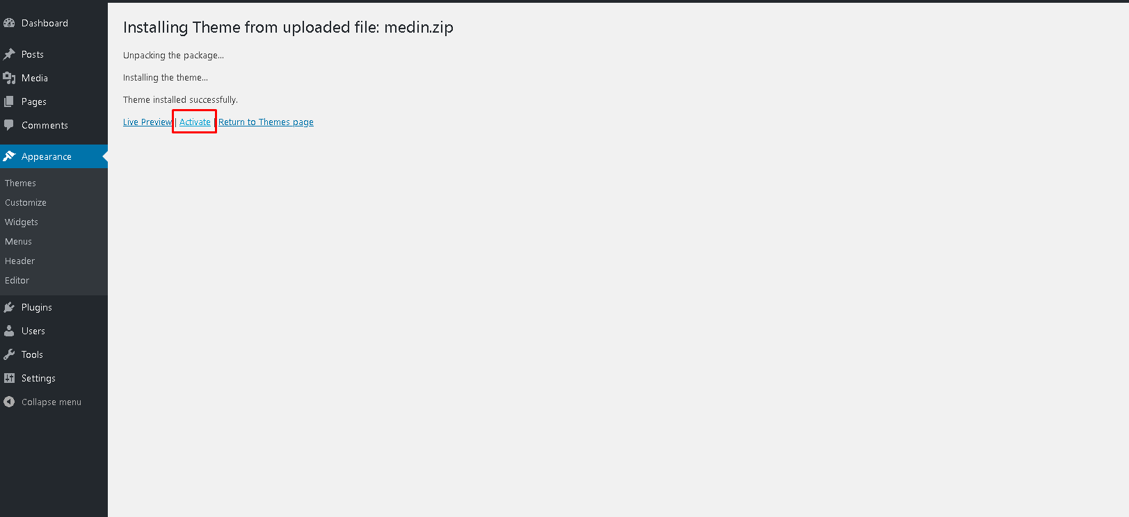 Click Activate or go in admin left menu: Appearance -> Themes and activate Medin