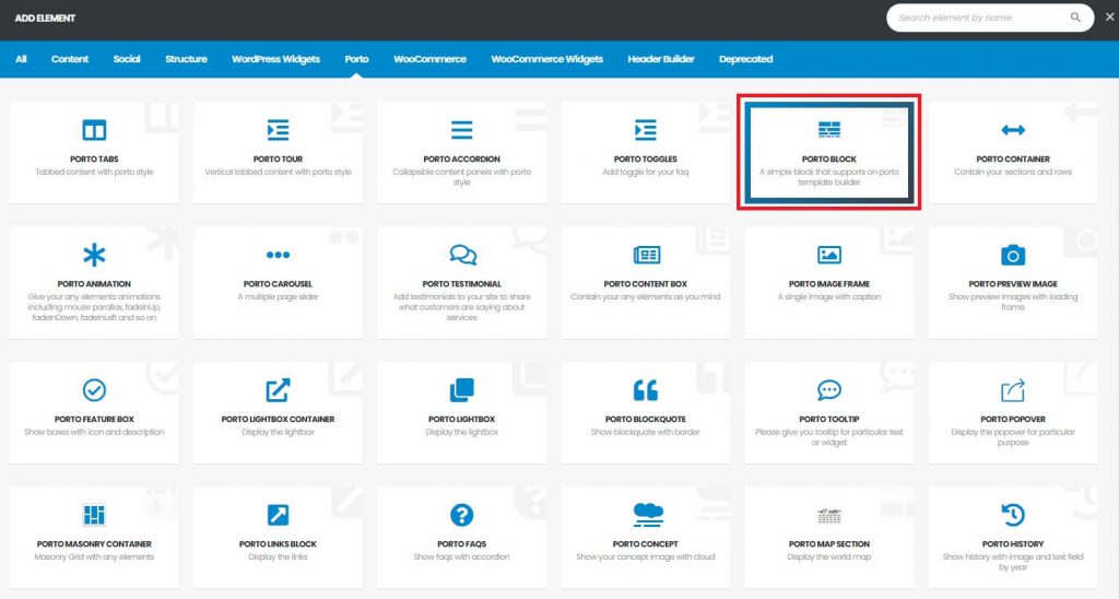 Sometimes, you should import the something which is built with Porto Block Template. In this case, you can use Shortcode of Elementor or Porto Block Element of WPBakery.