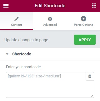 Step 4. Paste on element. Elementor Shortcode allows the block slug and Porto Block of WPBakery allows slug and id.