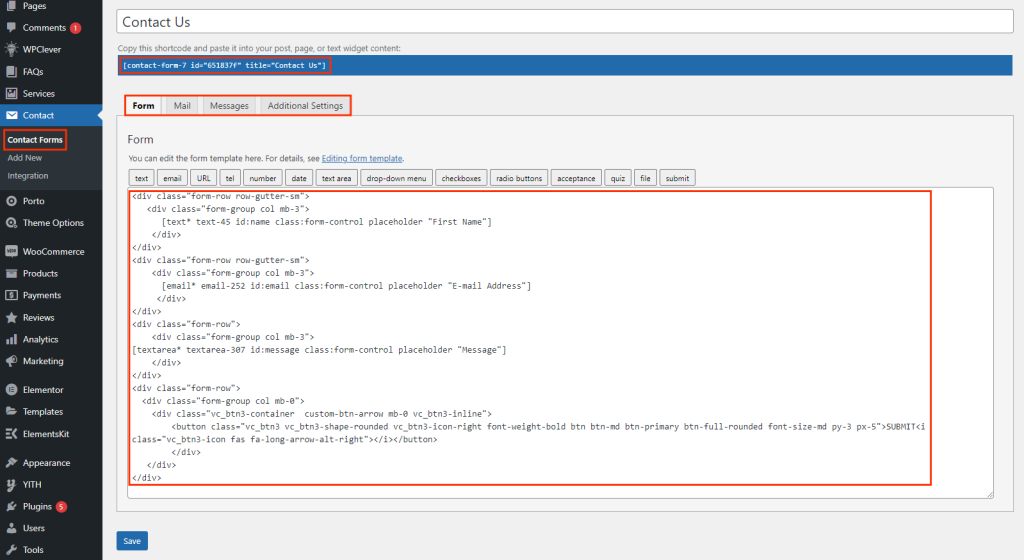 - Using Porto Contact Form Widget: Porto theme offers a custom Contact Form Widget, which makes it easy to add the form directly into your page layout. Just drag and drop the widget into your desired section.