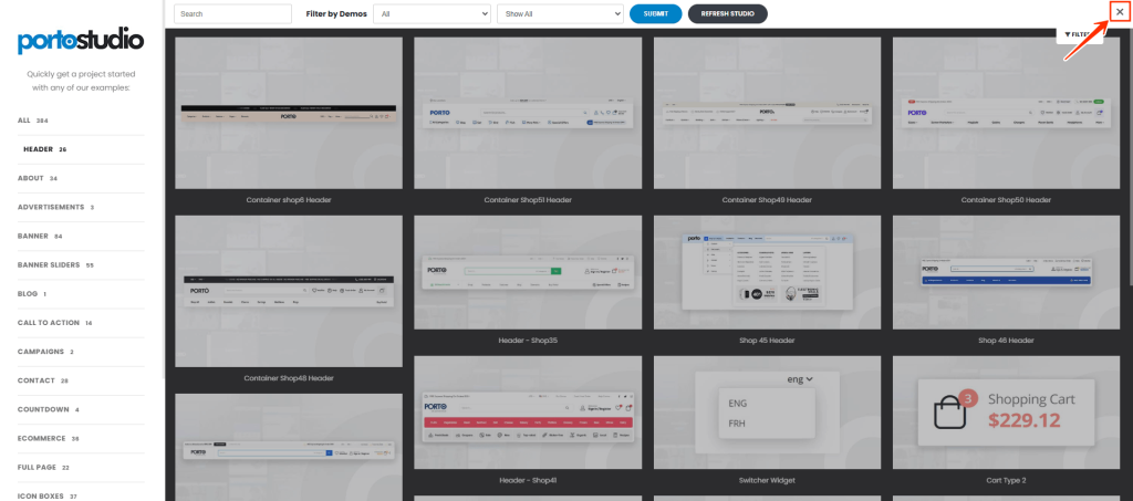 - Close Porto studio block list by clicking "close" button for building your site from scratch.