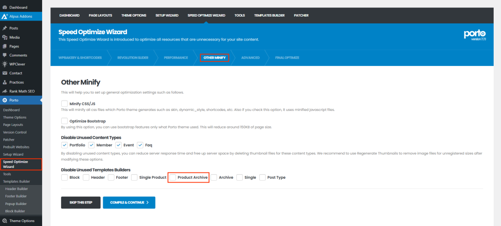 - Navigate to Porto > Speed Optimize Wizard > Other Minify
