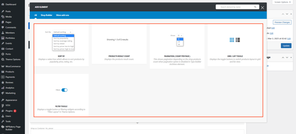 When editing with Elementor or WPBakery, you’ll find a wide 10 of Porto Product Archive Elements designed for product pages, such as Type Builder Archives, Sort by, Pagination, Products Result Count, Grid / List Style, Filter Toggle, Shop Hooks, Archive Title, Archive Description.
