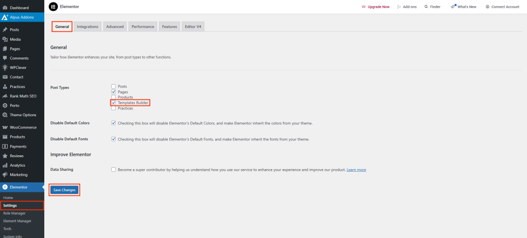- Go to Elementor > Settings in your WordPress Dashboard.