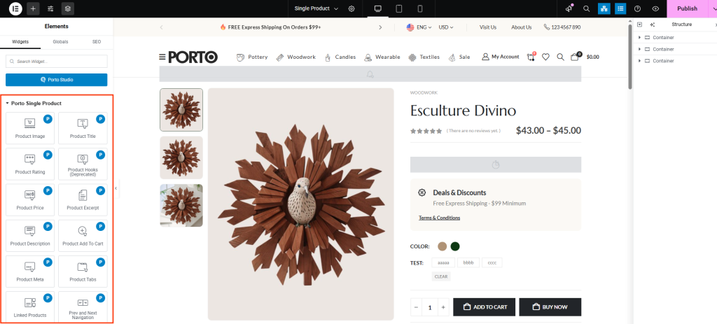 - Import a prebuilt single product layout from Porto Studio for a quick start, or