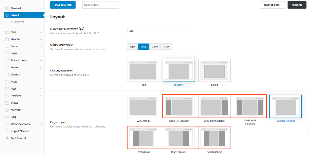Porto > Theme Options > Layout page