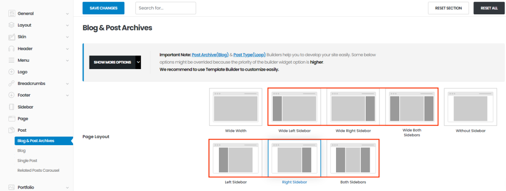 You can set blog & post archive page's layout here. Once you set sidebar layouts, you can see