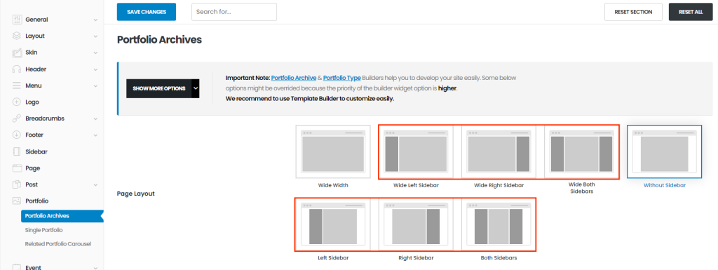You can set portfolio archive page's layout here. Once you set sidebar layouts, you can see select box of sidebar.