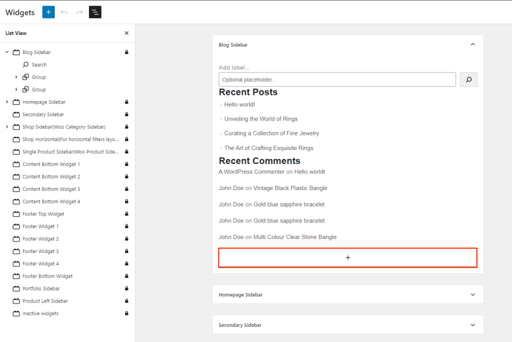 The latest WordPress update presents existing widget areas in a single column format. To add a widget, open the desired widget area, click the “+” icon, and enter the widget title to locate and insert it. Widget addition now operates seamlessly within the Gutenberg editor.
