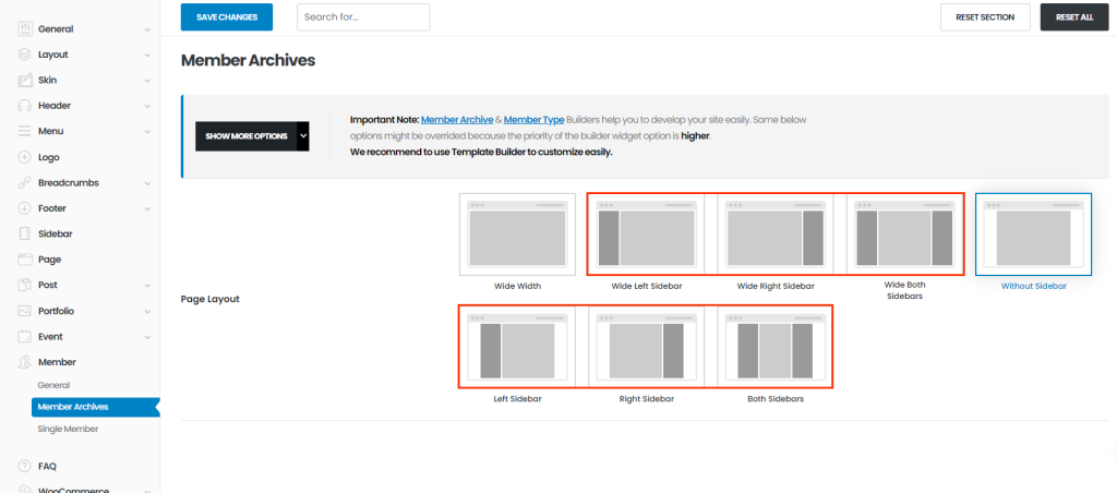 You can set member archive page's layout here. Once you set sidebar layouts, you can see select box of sidebar.
