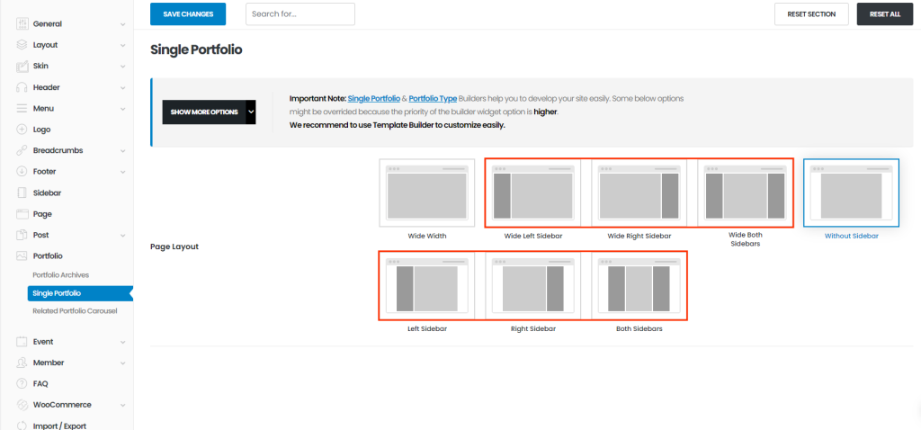 You can set single portfolio page's layout here. Once you set sidebar layouts, you can see select box of sidebar.