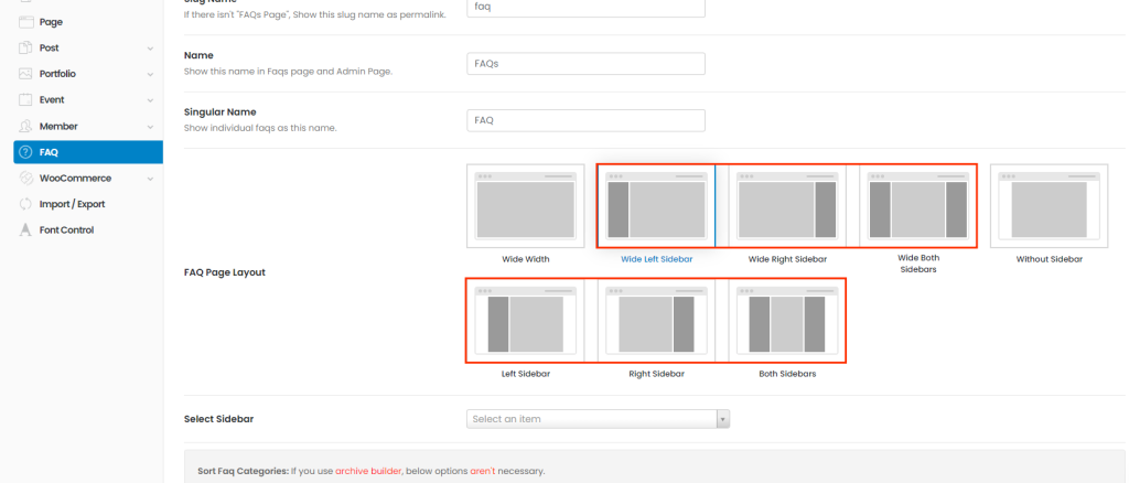 You can set FAQ page's layout here. Once you set sidebar layouts, you can see select box of sidebar.