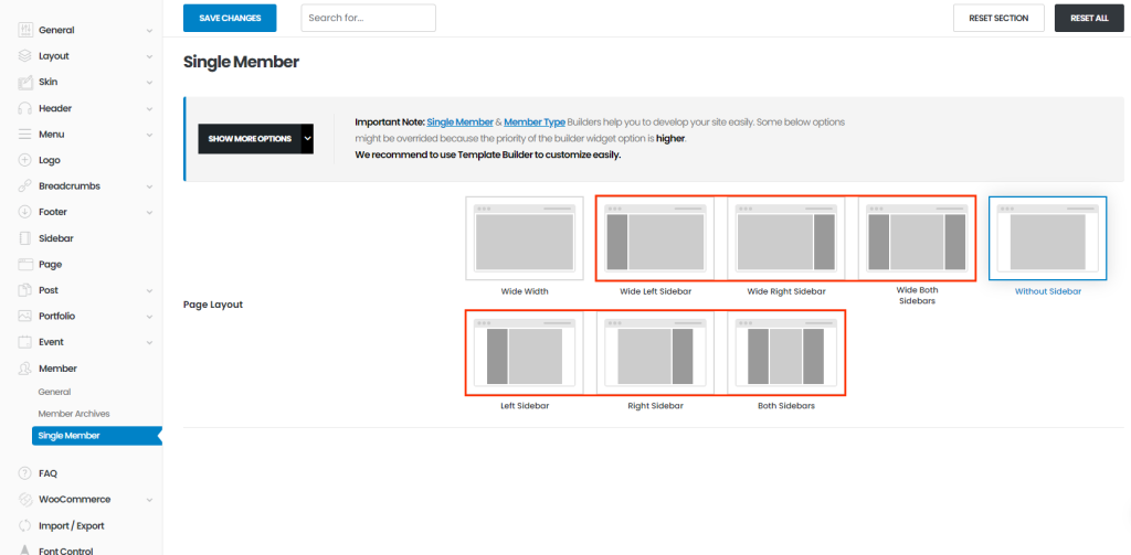 You can set single member page's layout here. Once you set sidebar layouts, you can see select box of sidebar.