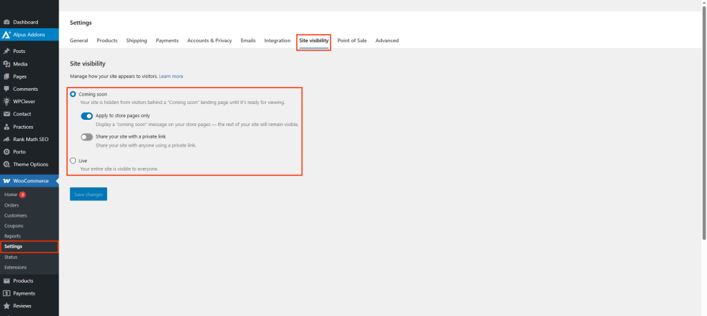 - Go to your WordPress Dashboard and navigate to: WooCommerce > Settings > Site Visibility