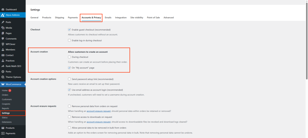 - Go to your WordPress Dashboard and navigate to WooCommerce > Settings > Accounts & Privacy.