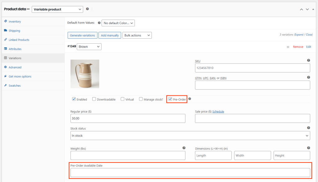 - In the Product Data panel, check Pre-Order