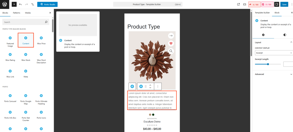 The Porto Content element is a dynamic text block within the Porto Post Type Builder that outputs either the post content or a customizable excerpt from the current post or product. This widget is commonly used in blog grids, portfolio cards, product listings, event cards, and any custom post-type layouts where you need text-based summaries.