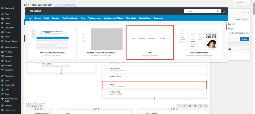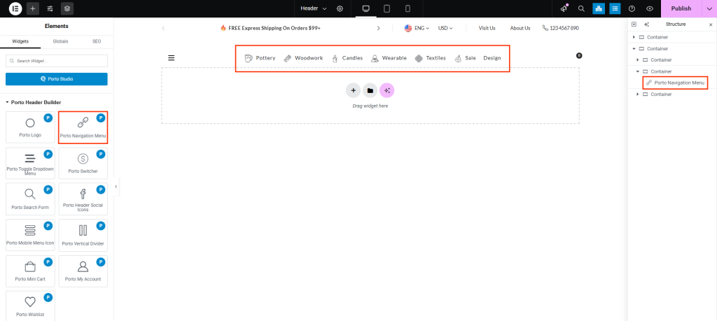 Drag or place the Porto Menu Element into your desired header row, sidebar, or custom template area.