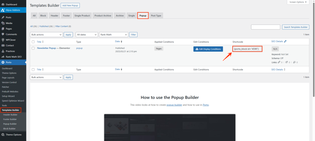 - Miscellaneous Things — Allows you to input custom HTML code in the Modal Content area. Here, you can also insert a shortcode of a popup block previously created using the Porto Popup Builder. You can find the popup’s shortcode in Porto > Theme Options > Popup.