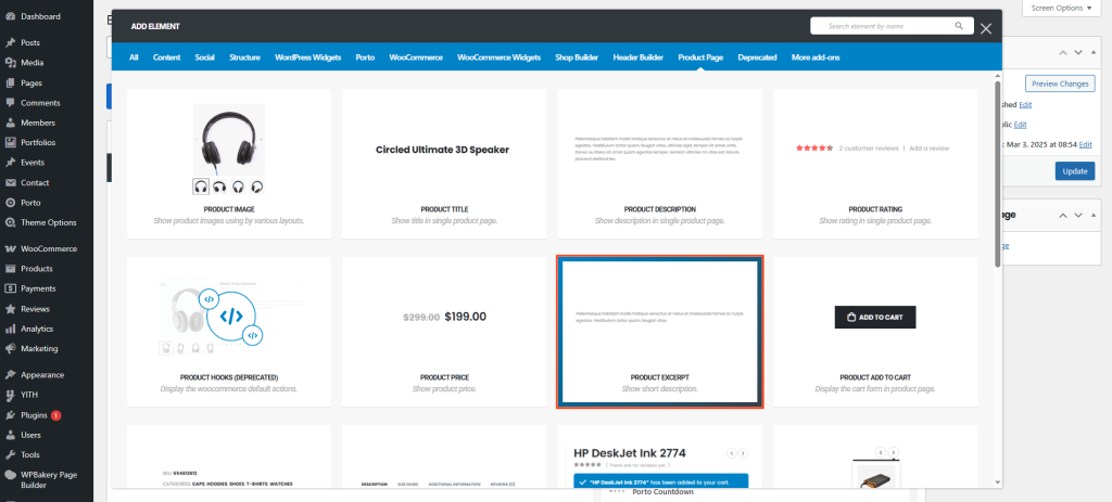 Go to Porto > Template Builder > Single Product and select the builder (Elementor or WPBakery). - Add the Product Excerpt Element