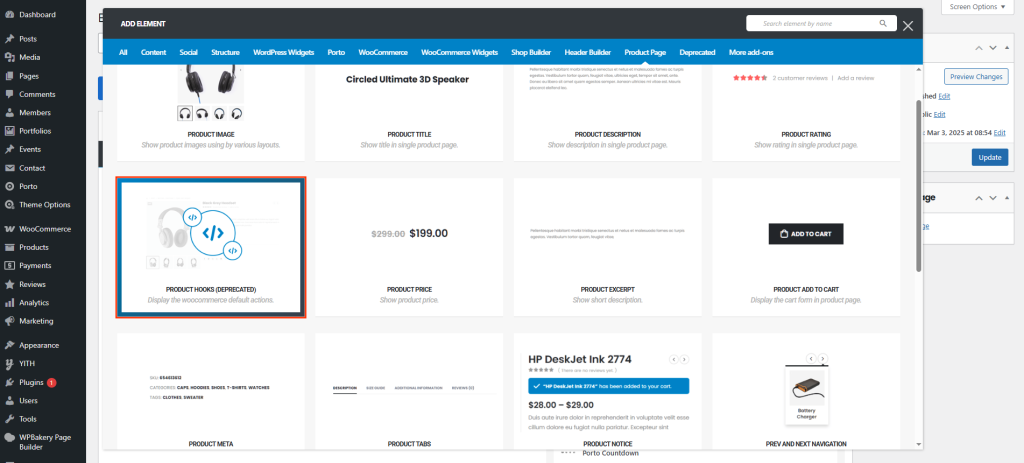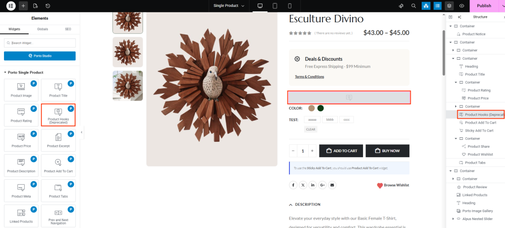 - Locate Product Hooks in the Porto elements panel.