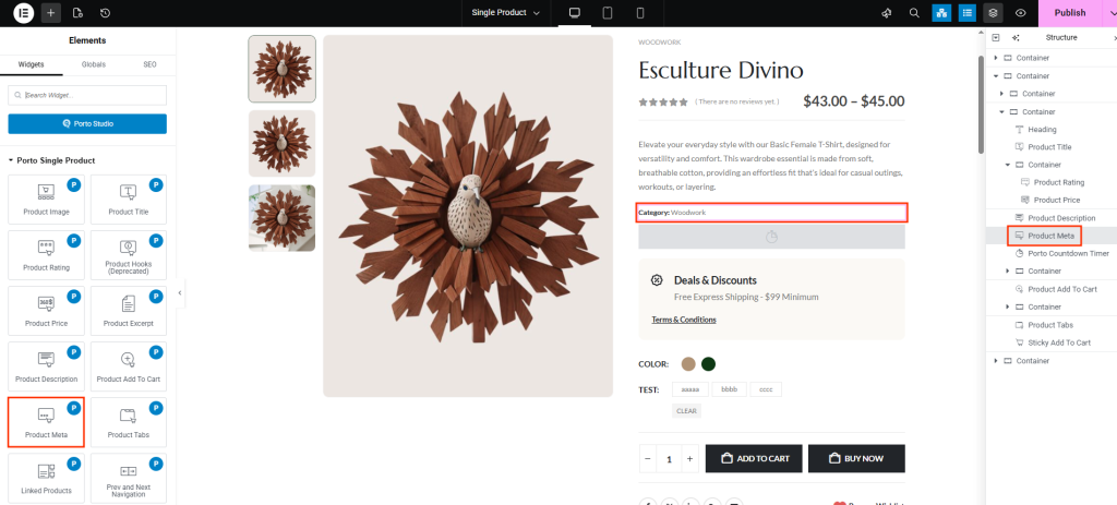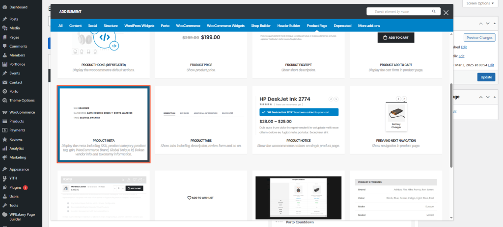 - From the Porto Single Product Elements section, drag and drop the Product Meta element into your design.
