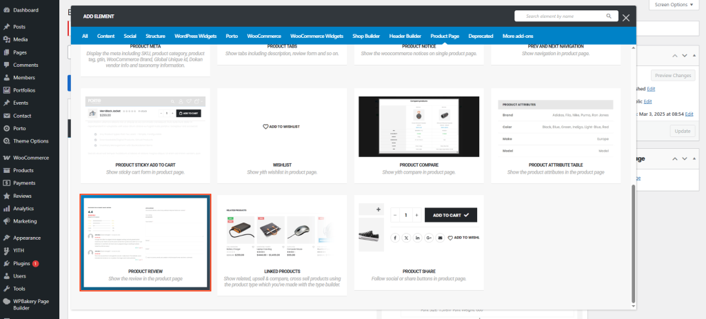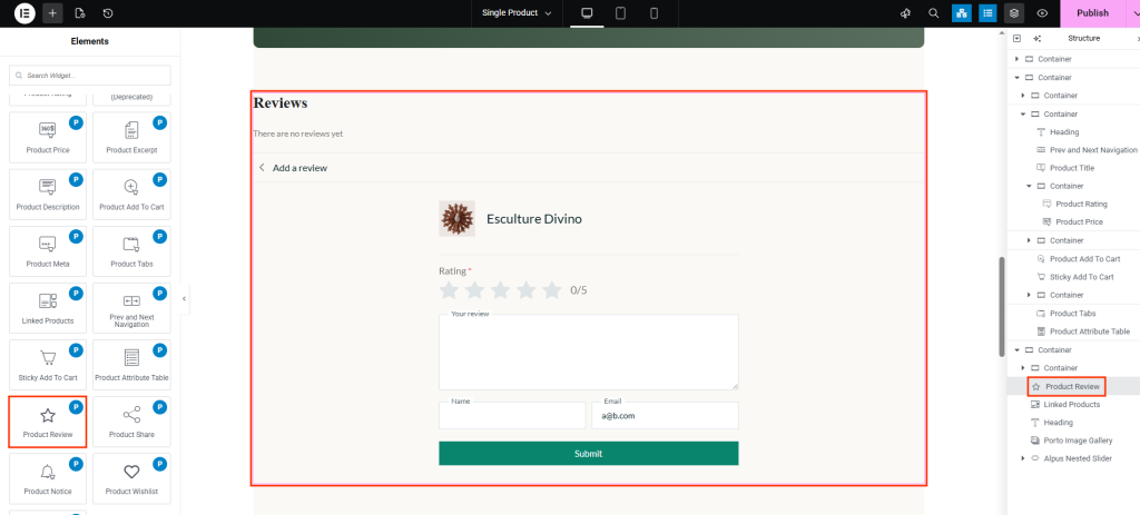 From the Porto Single Product Elements panel, drag Product Review into your layout.- Most users place it below the Product Tabs or near the bottom of the page.
