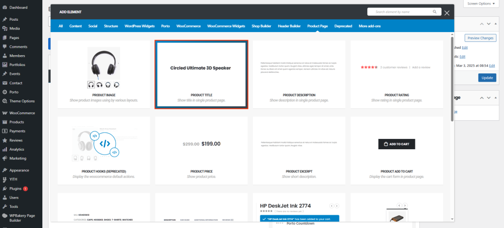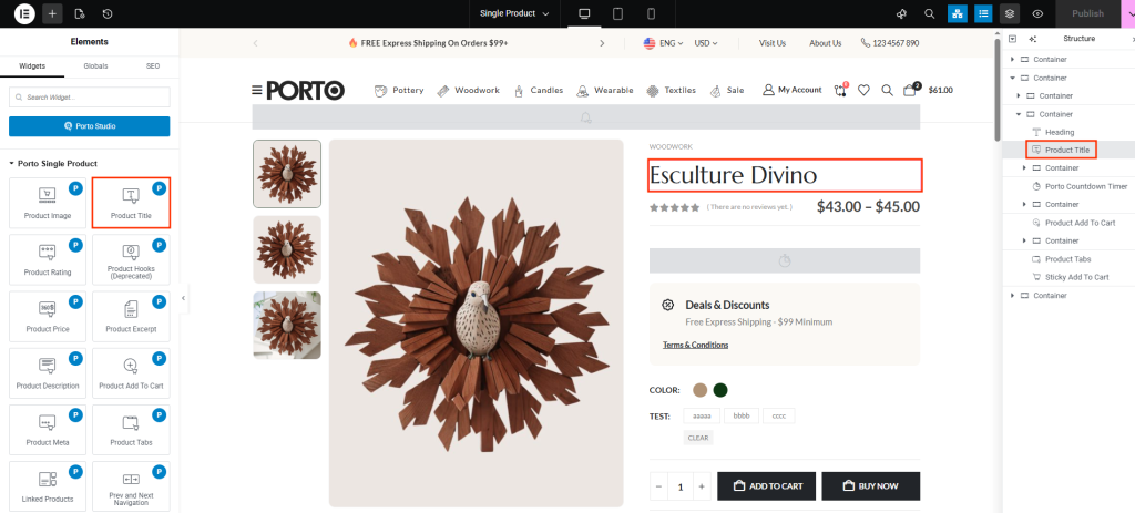 - From the Porto Single Product Elements section, drag Product Title into your desired location (typically above the price or product image).