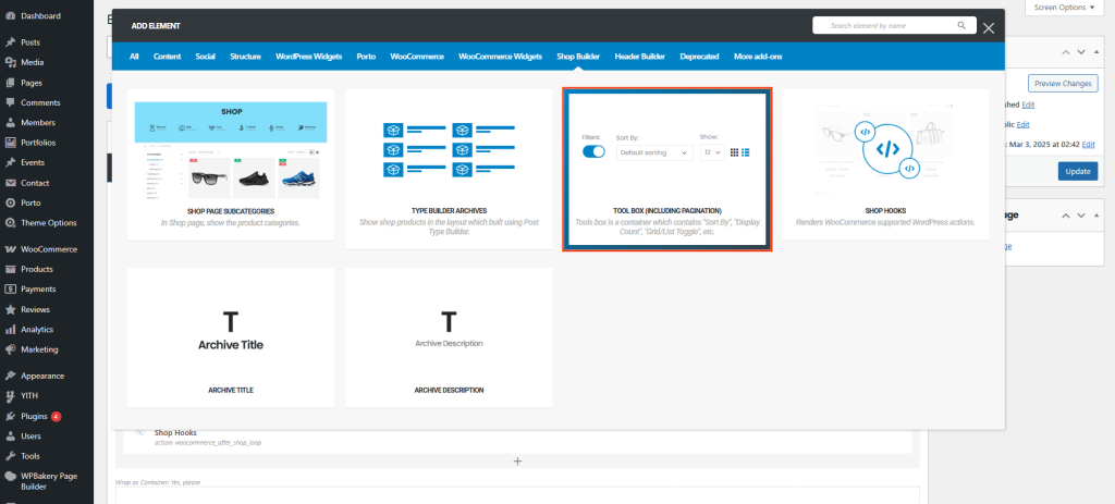 The Porto Tool Box element is a WPBakery-only structural element used when building Product Archive templates.