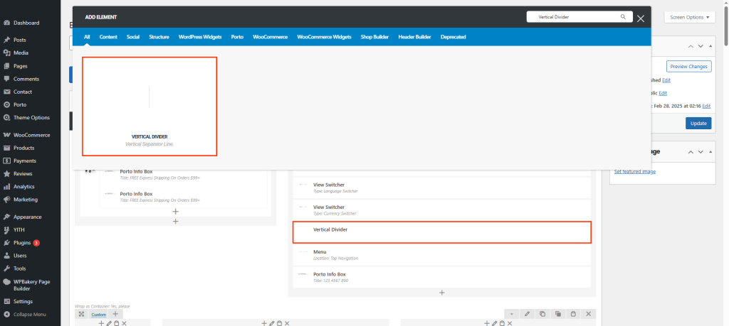 The Porto Vertical Divider Element helps you create a visually structured and intuitive header layout by separating different header elements with a clean vertical line. It enhances clarity, balance, and visual hierarchy in your header design.
