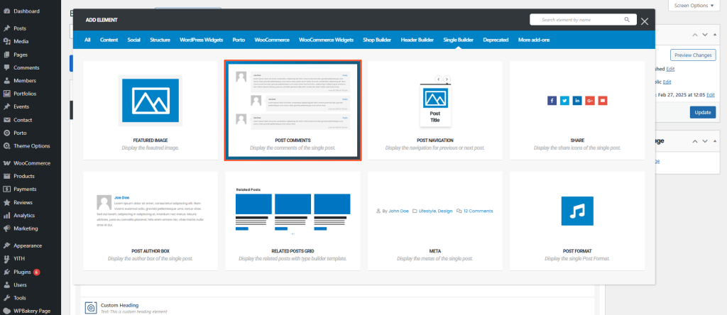 The Porto Post Comments element displays the comment list and comment form on single post pages created with the Porto Single Builder. It allows you to control spacing, typography, avatar styling, and interaction elements, ensuring that discussions remain readable and visually consistent with your layout.