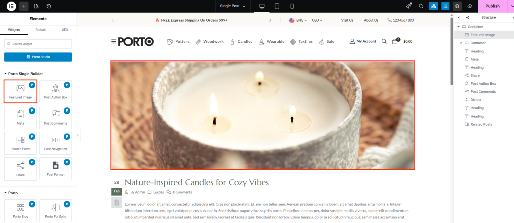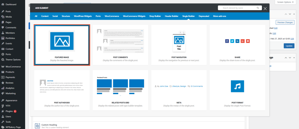 - Next, open the builder panel, locate Featured Image under Porto Single Builder Elements