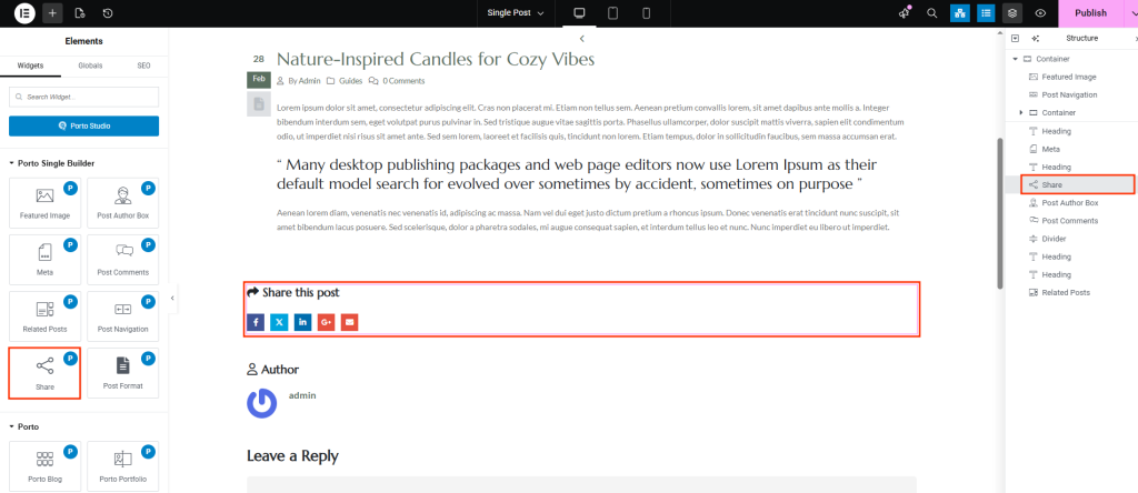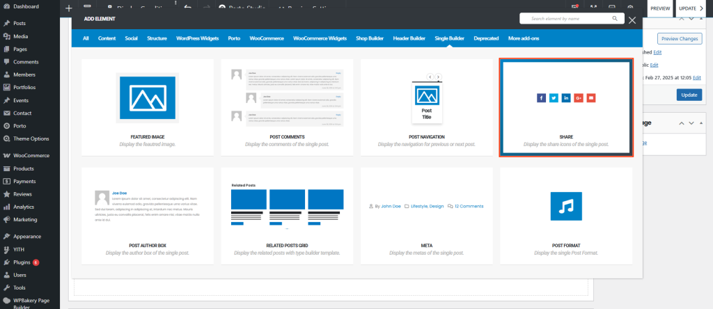 The Porto Post Share element allows you to display social sharing icons on single post layouts, helping visitors easily share your content across social networks.