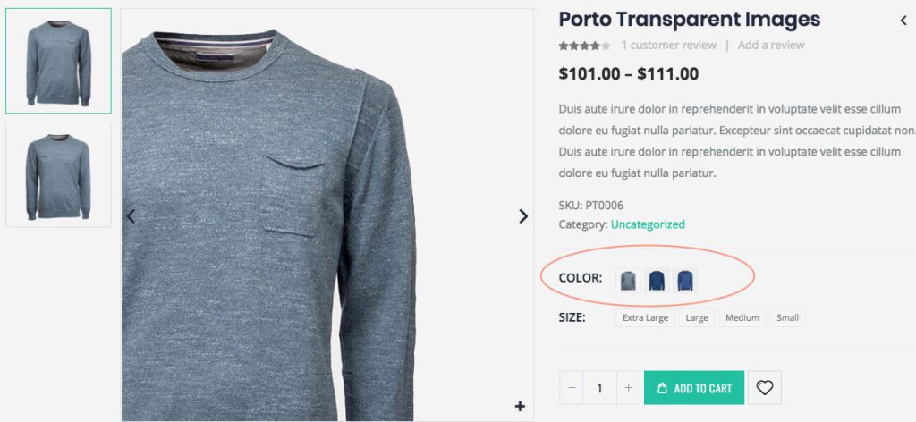 On single product pages, variation swatches appear inside the Porto Add to Cart element. This element is part of the Product Single Layout built using the Porto Product Single Builder.